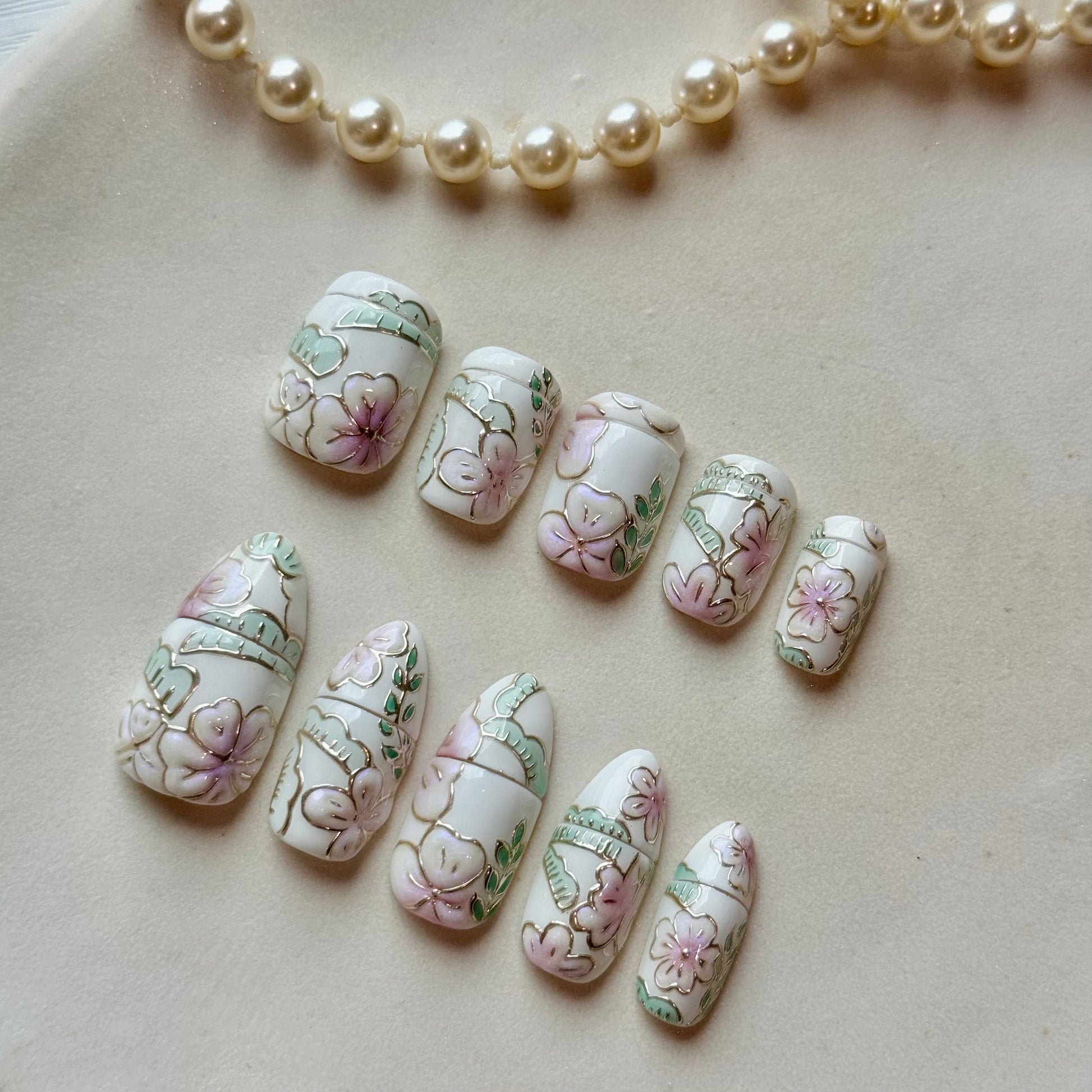 Enhance your feminine beauty with our Imperial Lacquer Clip-on Nails. This set is inspired by the delicate and gorgeous style of the mother of pearl and gold-trimmed lacquer furniture popular in Ancient China.